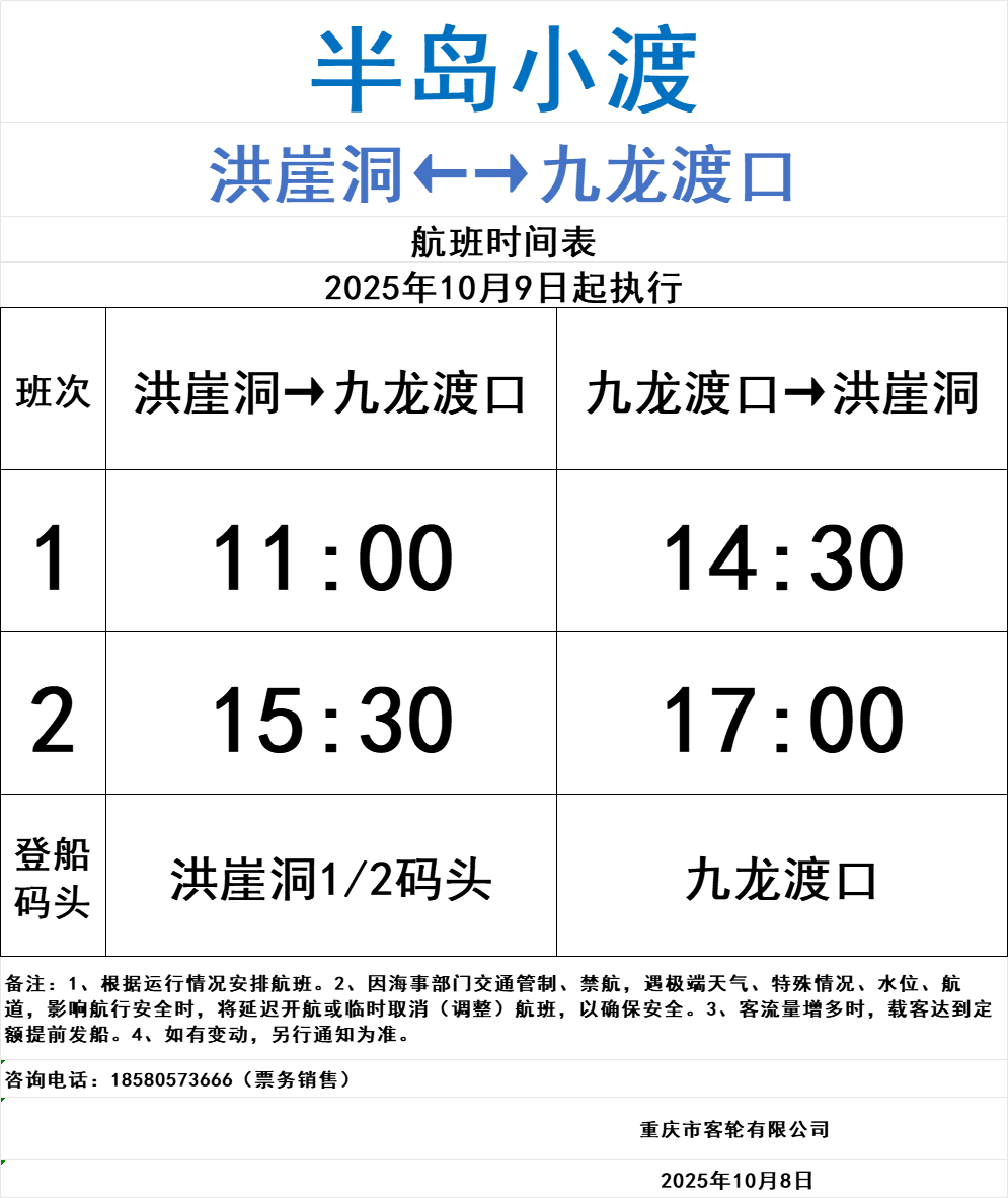 半岛小渡(洪崖洞-九龙渡口)航班时间表