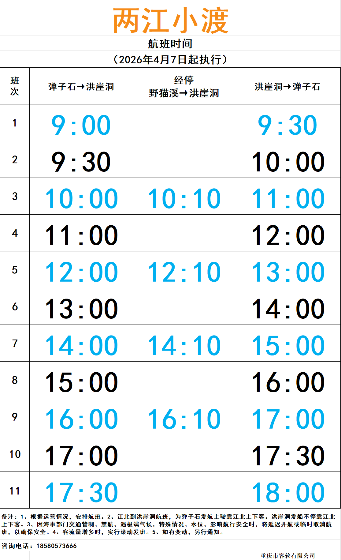 两江小渡(洪崖洞-弹子石-江北嘴)航班时间表