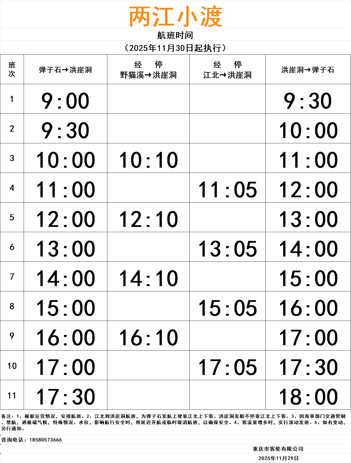 两江小渡(洪崖洞-弹子石-江北嘴)航班时间表
