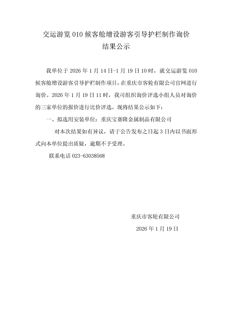 交运游览010候客舱增设游客引导护栏制作询价结果公示