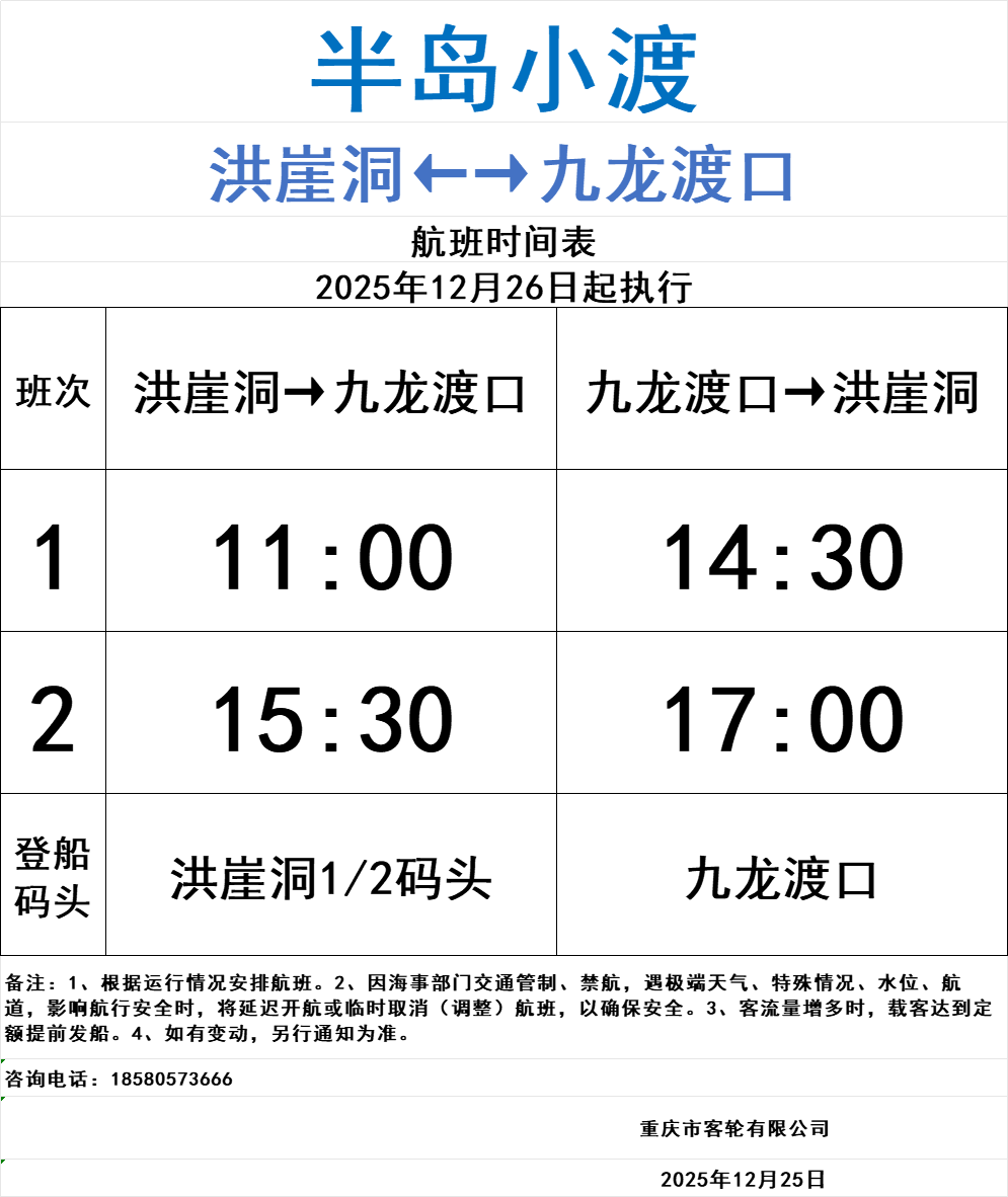 半岛小渡(洪崖洞-九龙渡口)航班时间表