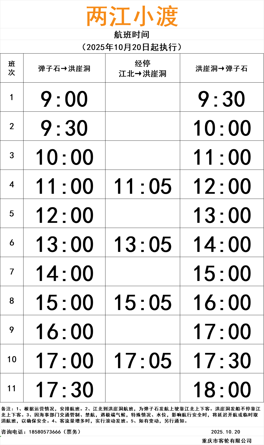 两江小渡(洪崖洞-弹子石-江北嘴)航班时间表